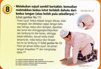8. • Melakukan sujud sambil bertakbir, kemudian meletakkan kedua lutut terlebih dahulu daripada kedua tangan (atau boleh pula sebaliknya). [31]