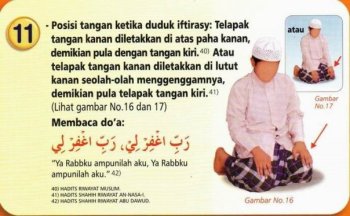 11. – Posisi tangan ketika duduk iftirasy: telapak tangan kanan diletakkan di atas paha kanan, demikian pula dengan tangan kiri.[40] Atau telapak tangan kanan diletakkan di lutut kanan seolah-olah menggenggamnya, demikian pula telapak tangan kiri. [41]