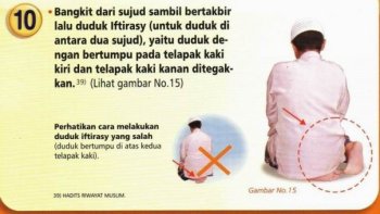 10. • Bangkit dari sujud sambil bertakbir lalu duduk Iftirasy (untuk duduk di antara dua sujud), yaitu duduk dengan bertumpu pada telapak kaki kiri dan telapak kaki kanan ditegakkan. [39]